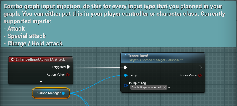 PlayerControllerorCharacter, bind the input event and trigger the combo graph using the tag you defined.