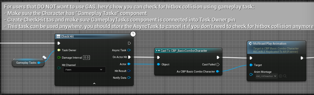 It’s the same as when using GAS but instead of using AbilityTask, you’ll implement hit logic using GameplayTask from your character or component blueprint.