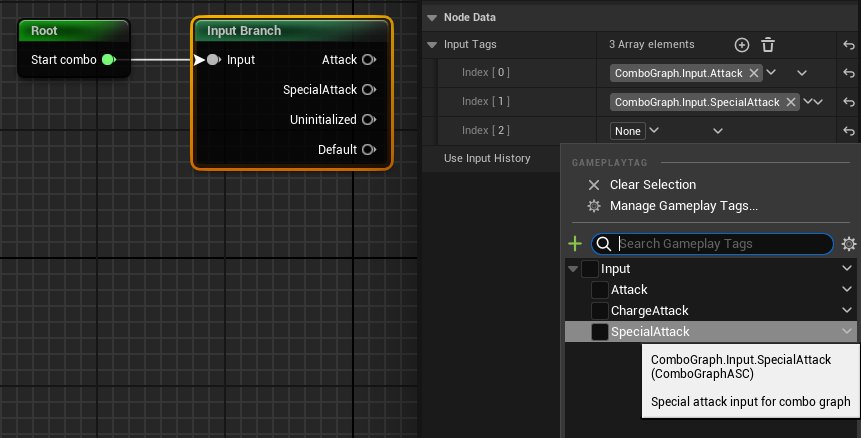 Click the node and configure it using the Node Data panel. Specify which input (via Gameplay Tags) triggers the next combo step. Tags must begin with ComboGraph.Input (e.g., ComboGraph.Input.Attack).