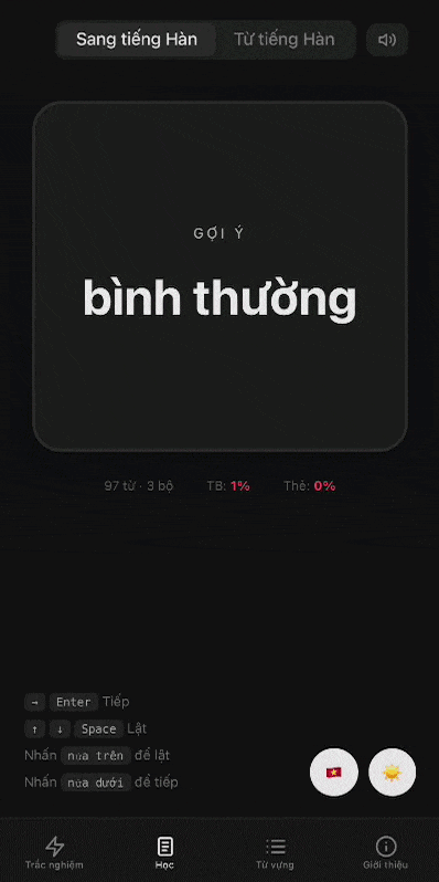 HanCards is a simple, offline-capable flashcard web app for learning Korean vocabulary. Users can add their own vocabulary sets via CSV or study with built-in decks. The app is lightweight, works fully offline, and supports both English and Vietnamese interfaces.